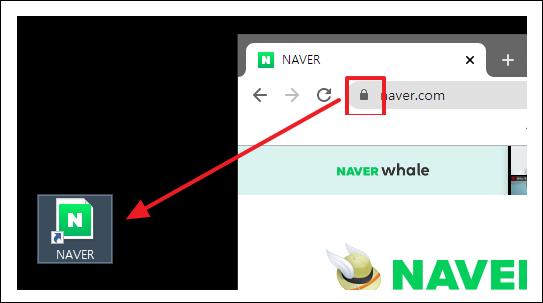 2. 브라우저 주소창 왼쪽의 자물쇠 아이콘을 마우스로 클릭 후 드래그하여 바탕화면으로 옮깁니다.