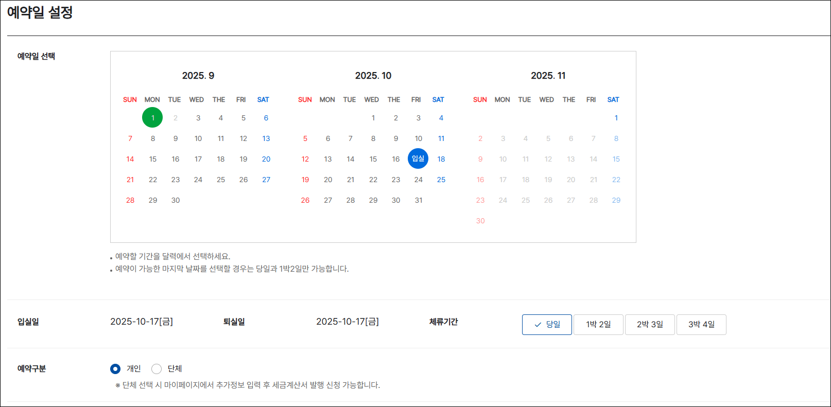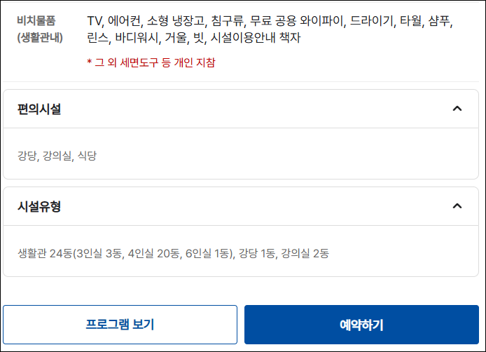 - 객실 및 프로그램 선택: 이용 가능한 객실(2인실, 4인실 등)과 참여하고 싶은 프로그램을 선택합니다.