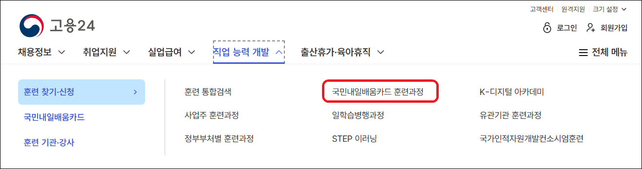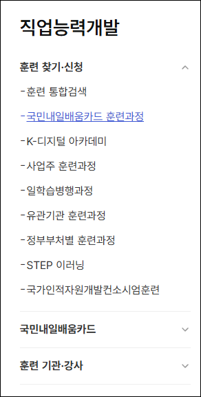 - 상단 메뉴에서 [훈련] → [국민내일배움카드] 클릭