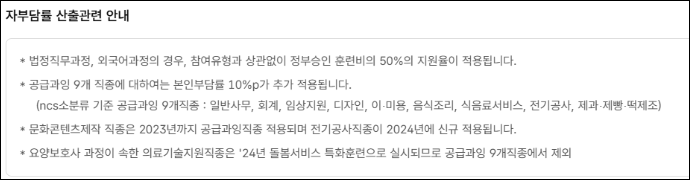 - 특화 과정 (국가기간전략산업직종, 첨단산업 등): 일부 과정은 전액 지원 (자기부담금 0%)