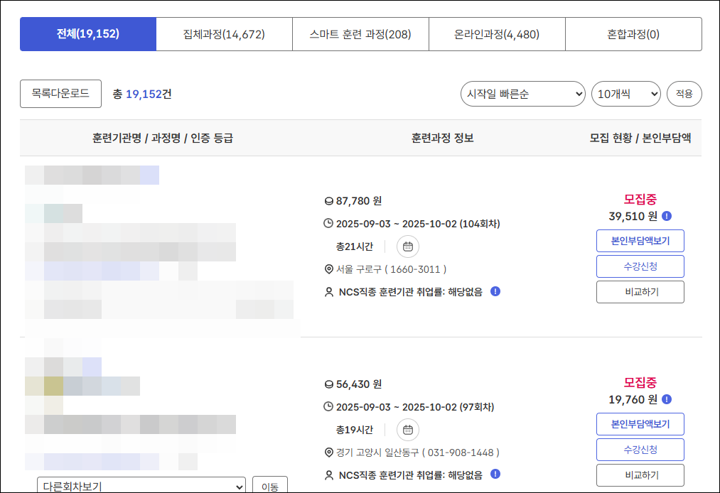 - 기타 필터: 개강일, 훈련기관, 수강료, 인증유무 등