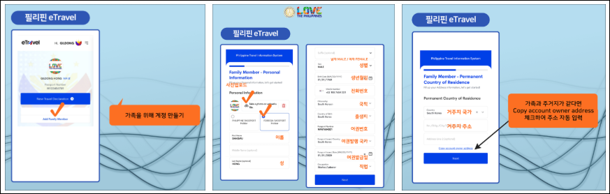 | 가족 멤버 추가 | ‘Add Family Member’ 또는 ‘가족 멤버 추가하기’ 버튼 클릭 후가족별 정보 입력 | 이름, 생년월일, 여권번호, 관계 등 영문 입력 권장 |