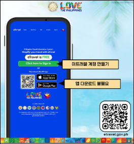 이트래블 등록은 반드시 공식 웹사이트(https://etravel.gov.ph) 또는 앱을 통해 무료로 진행해야 하며,