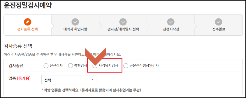 - 예약을 시작하기 전에, 검사 종류에서 '자격유지검사'를 선택해야 합니다. 이 단계에서 자신이 진행하려는 검사의 종류를 정확히 확인하고 선택하는 것이 중요합니다.