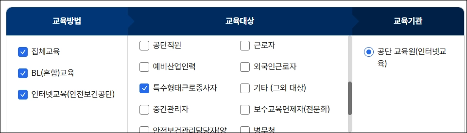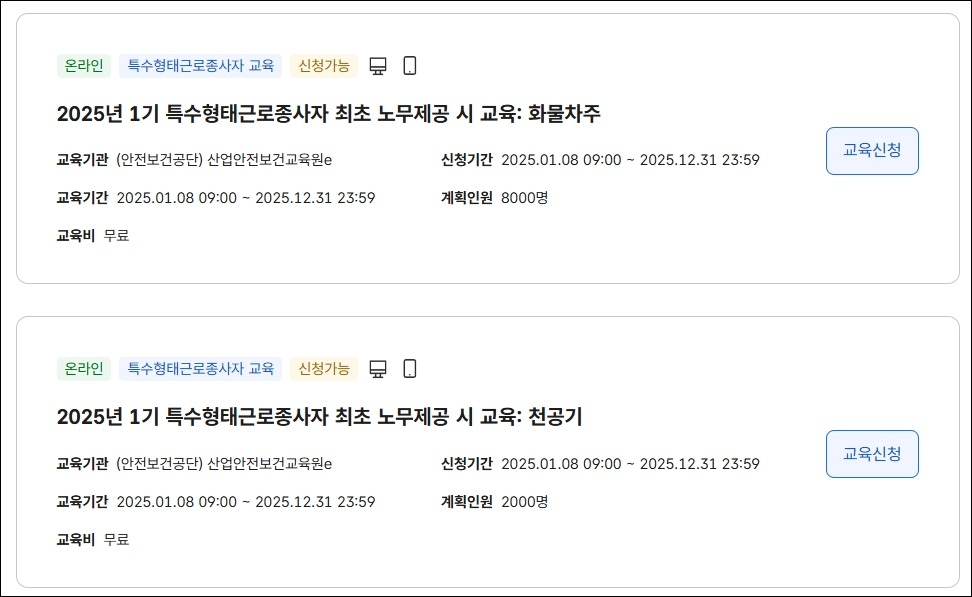 - 산업안전보건공단 또는 지정된 안전교육 기관의 웹사이트에서 특수형태 근로자용 과정을 확인합니다.