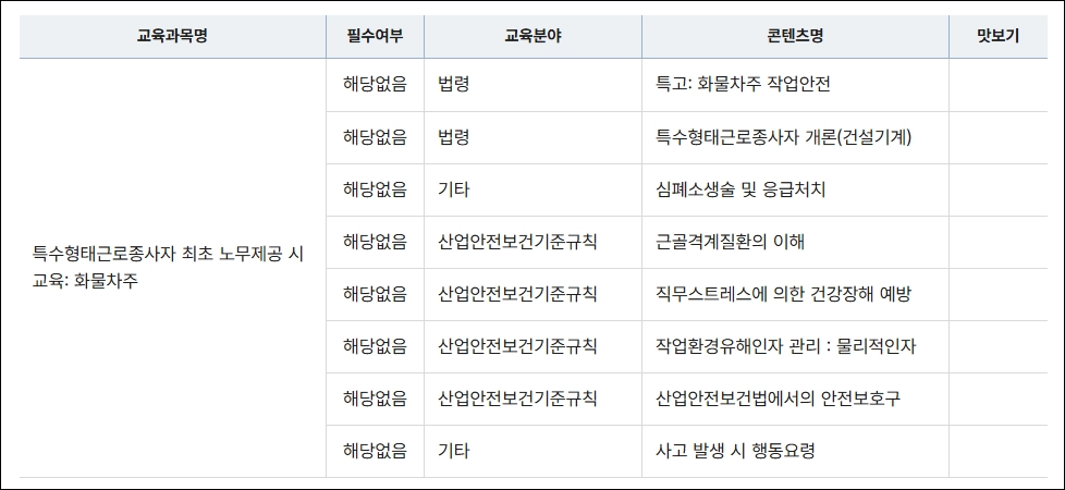 - 일부 직종은 사업주 또는 소속 업체가 교육 이수를 확인해야 함