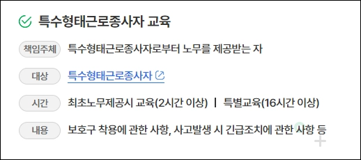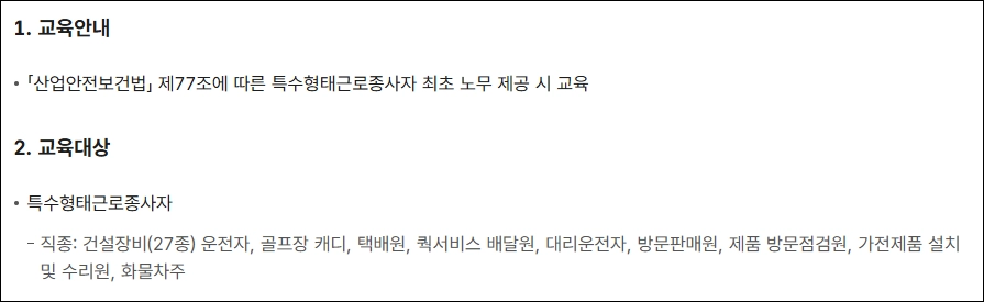 - 2021년 개정 이후 특수형태근로종사자도 산업재해 예방을 위한 교육을 받을 수 있도록 규정됨