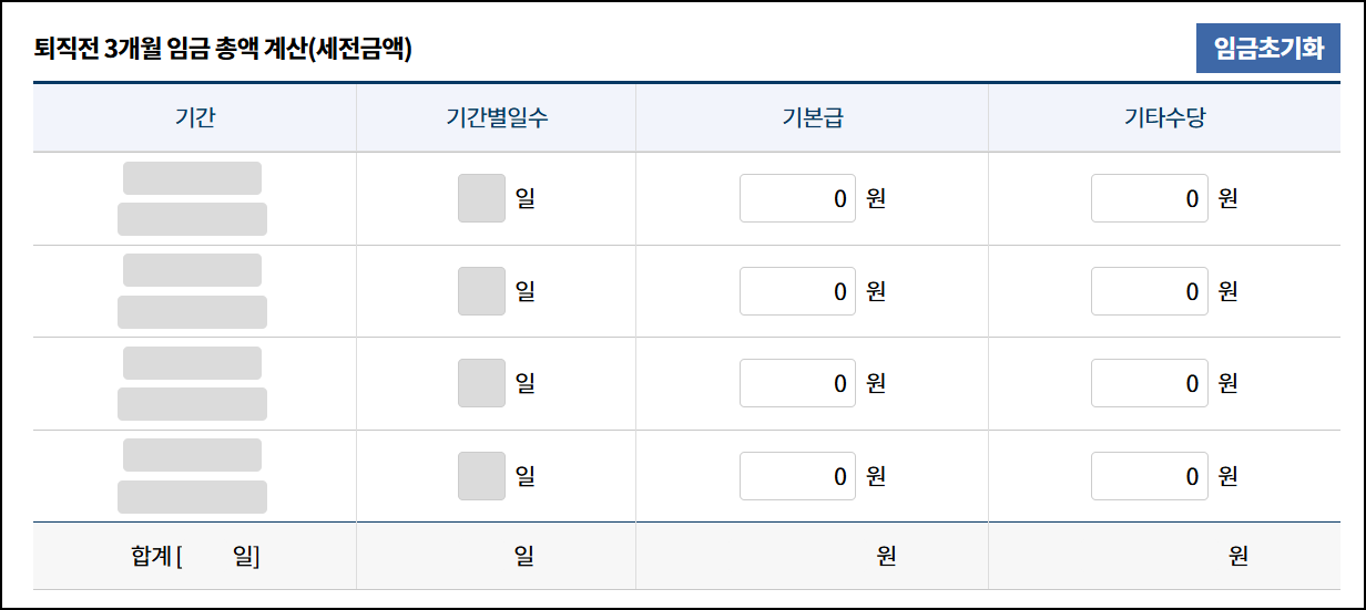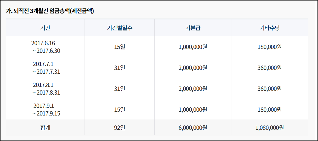 - 퇴직 직전 3개월의 총 지급액(세전)을 정확히 합산.
