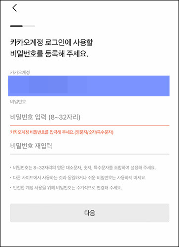 통합된 경우 카카오 계정 비밀번호를 사용합니다. - 2단계 인증이 활성화된 경우, 모바일 기기로 전송된 인증 코드를 입력합니다.