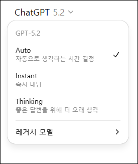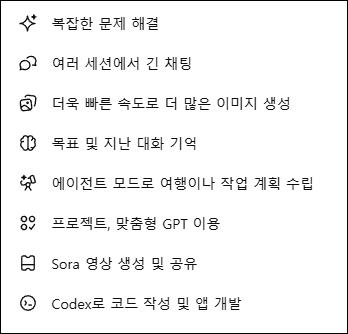 - 모델 선택- 인터페이스에서 기본 제공되는 GPT-5 또는 무료 제공 모델이 자동 선택되며, 일부 경우 GPT-4o 계열 경량 모델이 기본값으로 설정될 수 있습니다.