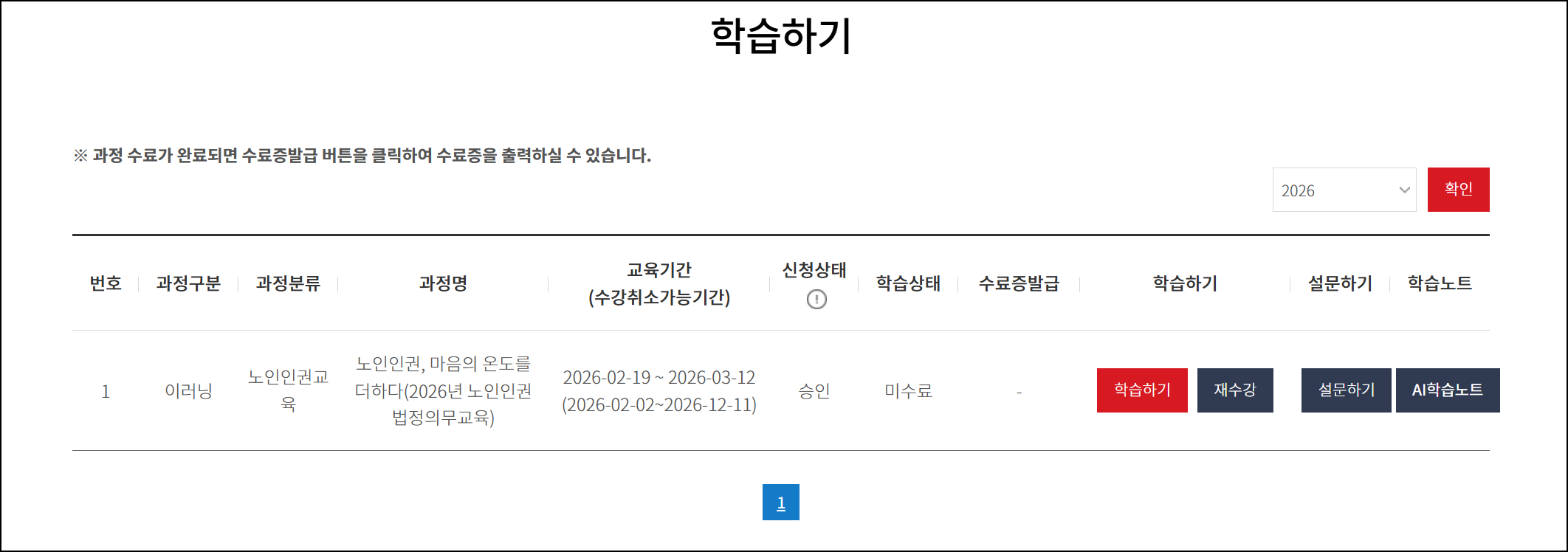 회원가입과 로그인이 완료됐다면 이제 수강신청을 진행합니다. 수강신청 시 가장 중요한 것은 반드시 2026년 표기가 된 최신 과정을 선택하는 것입니다. 연도를 확인하지 않고 신청했다가 작년 과정을 수강해서 이수 실적이 반영되지 않는 경우가 매년 발생합니다.