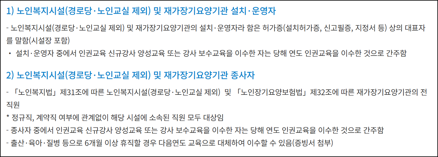 노인인권교육이 누구에게 해당되는지 먼저 확인하는 것이 중요합니다. 의외로 본인이 의무 대상인지 모르고 있다가 나중에 미이수 통보를 받는 경우가 적지 않습니다. 아래 표를 참고하여 본인이 교육 대상인지 확인하세요.