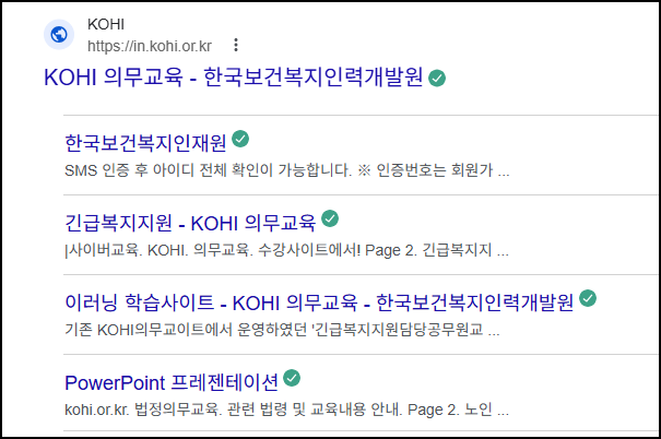 의무교육 수강만을 목적으로 접속한다면 edu.kohi.or.kr이 가장 빠릅니다. 포털 검색창에 '코히 의무교육' 또는 '한국보건복지인재원 의무교육'을 검색해도 공식 사이트로 이동할 수 있습니다.