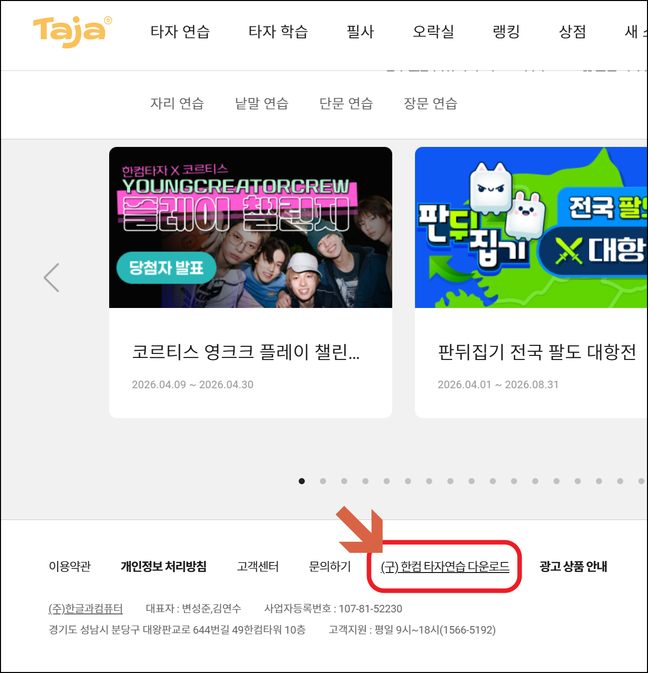 한글과컴퓨터 공식 홈페이지 hancom.com 자료실 > 한컴 타자연습 메뉴