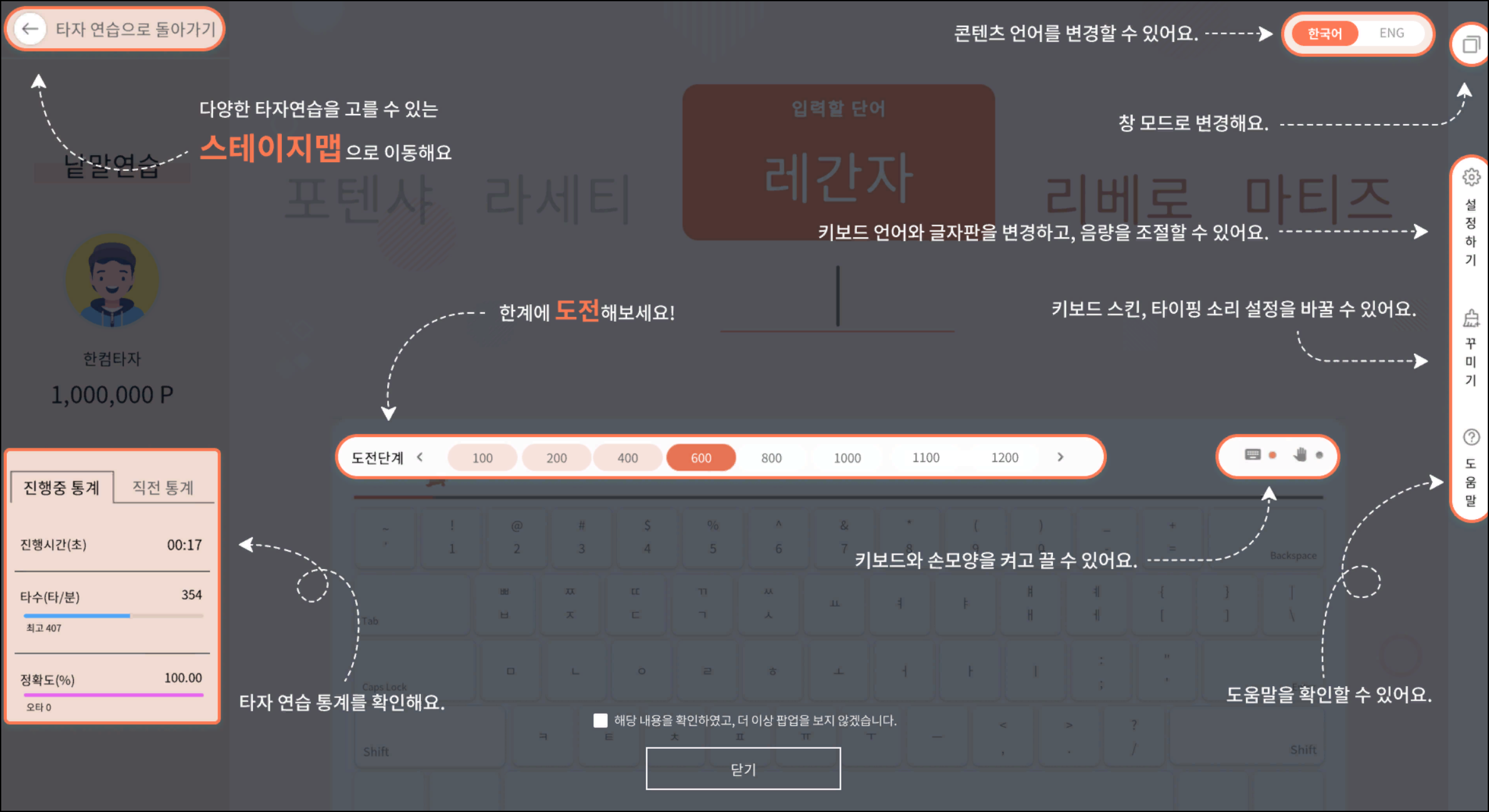 영문 자리연습·낱말연습·문장연습 모드가 모두 제공됩니다.